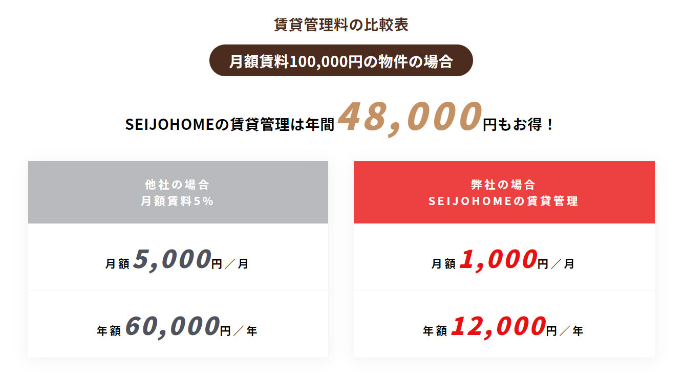 従来の不動産賃貸管理サービスは、管理手数料の報酬根拠が業界慣習で曖昧でしたが、SEIJOHOMEは賃料の大小に関わらず、オーナー様より全部屋一律1,000円で管理を請け負っている日本初のDXを積極活用した不動産賃貸管理会社です。管理料が定額になることで、オーナー様の利回りに貢献出来て、SEIJOHOMEは創業以来、オーナー様との管理委託契約の継続率は100%を維持しています。