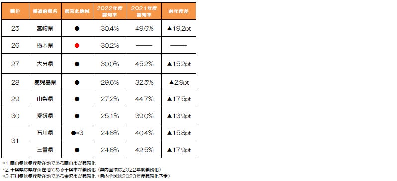 (注3)石川県は県としては2023年度に義務化予定ですが、県庁所在地である金沢市が2022年度より前に義務化していたため、本リリースでは義務化地域として扱っています。