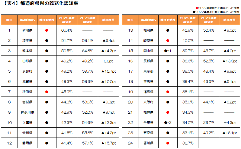 また、都道府県別では、2022年度より前に義務化した地域の義務化認知率の低下が目立ち、2022年度に県が義務化した千葉県を除き(注2)、全地域で低下しました。なお14都道府県においては、義務化認知率が前年度に比べて10ポイント以上低下しました。【表4】