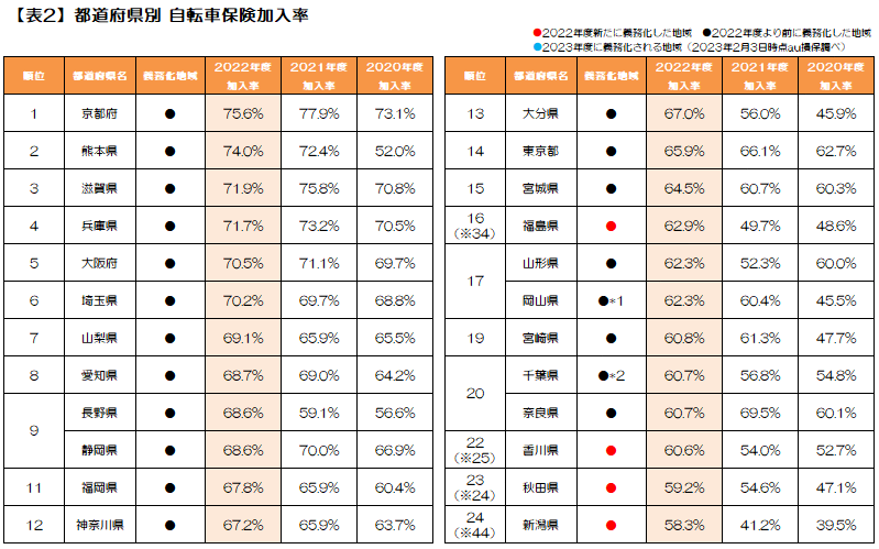 2023年度中には47都道府県中33都道府県の地域で、自転車保険の加入が義務化されることが決まっており(調査時点)、義務化地域が日本全国の7割相当にまで拡大します。