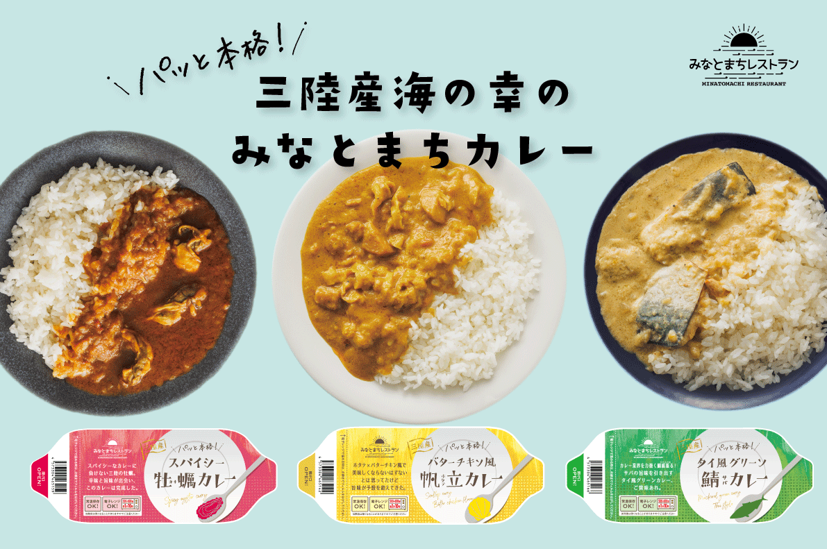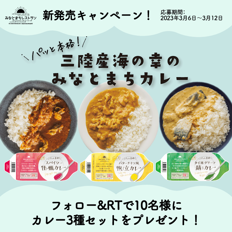 新発売を記念して「パッと本格!三陸産海の幸のみなとまちカレー3種セット」をプレゼントいたします。