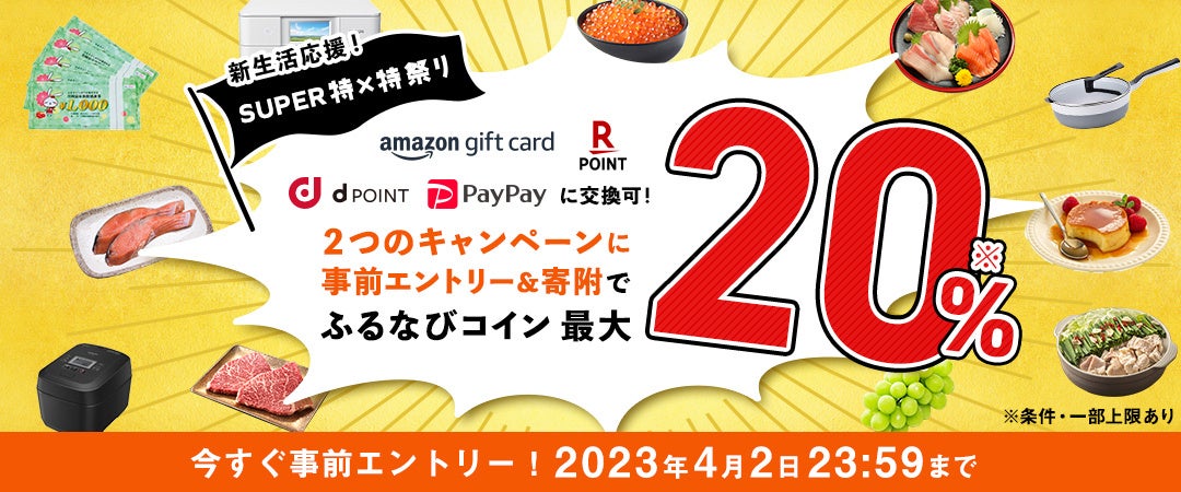 ①最大10%分!付与上限なし! 2023新生活応援 特×特キャンペーン 事前エントリー&寄附でふるなびコインがもらえる! 【期間】2023年3年6日(月)12:00~2023年4月2日(日)23:59 【参加条件】 1.ログイン、または新規会員登録(無料) 2.キャンペーンへエントリー 3. ログイン状態にてクレジットカード決済、またはAmazon Pay、PayPay、楽天ペイ、d払いで対象の返礼品に寄附 【注意事項】本キャンペーンは、予告なく中断、中止、変更する場合がございます。 詳細についてはキャンペーンページをご覧ください。 ( https://furunavi.jp/c/cp_present202303_a ) ②初めての寄附で最大+10%分もらえる! 2023新生活応援デビューキャンペーン 事前エントリー&寄附でふるなびコインがもらえる! |
