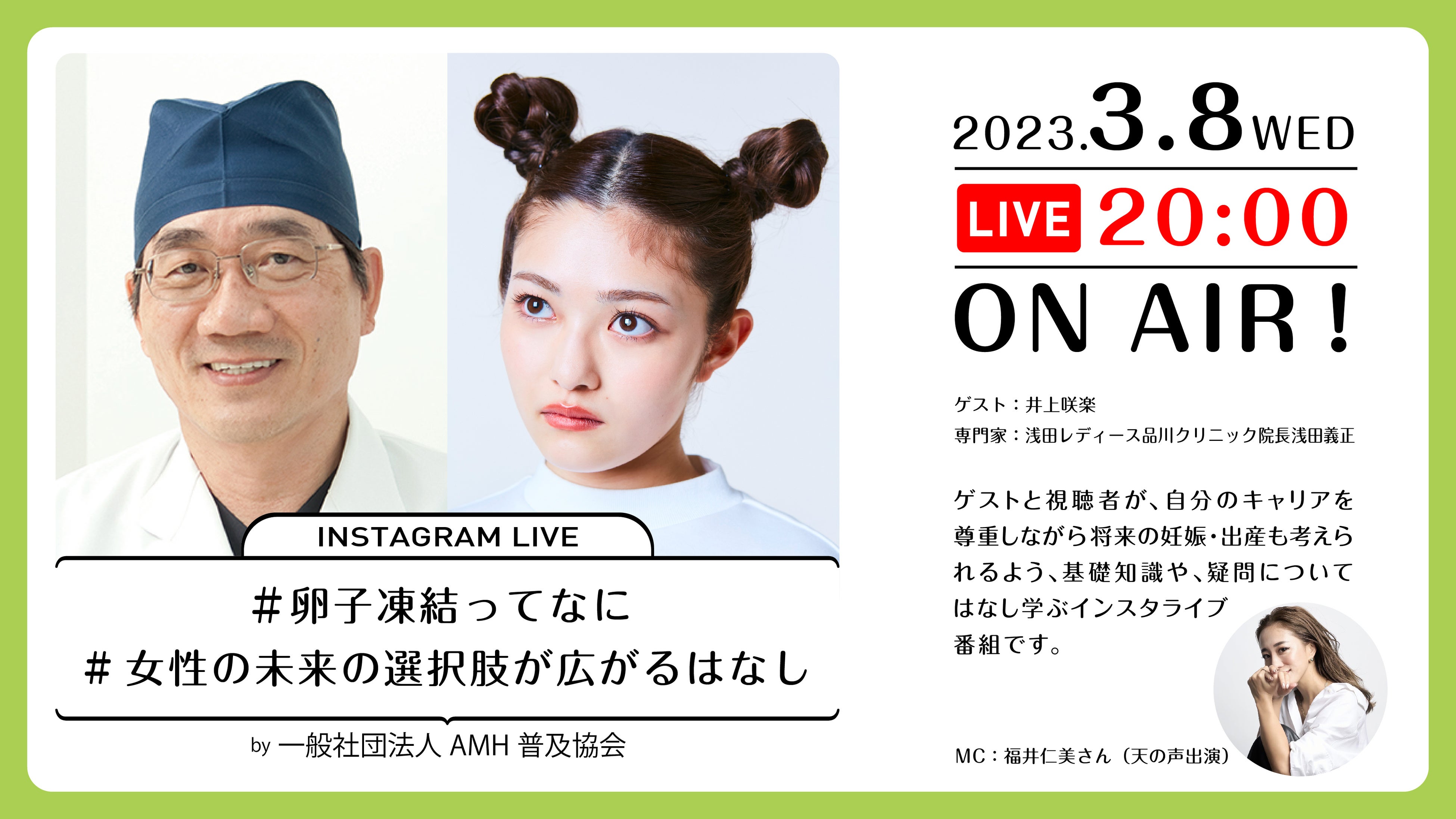 「#卵子凍結ってなに #女性の未来の選択肢が広がるはなし」 はゲストと視聴者が、自分のキャリアを尊重しながら将来の妊娠・出産も考えられるよう、“卵子凍結”という選択肢に関する基礎知識や、疑問について専門家の浅田先生から学ぶインスタライブ番組です。今後のキャリアや職場環境を考えると妊娠・出産になかなか踏み出せないという声も多く聞かれます。そこで、若いうちに健康な卵子を採取し凍結することで、妊娠・出産の時期を自分で選択することができるのが“計画的卵子凍結”です。東京都では、2023年4月から健康な女性の卵子凍結保存に関する助成制度が始まるなど、今注目されているトピックです。