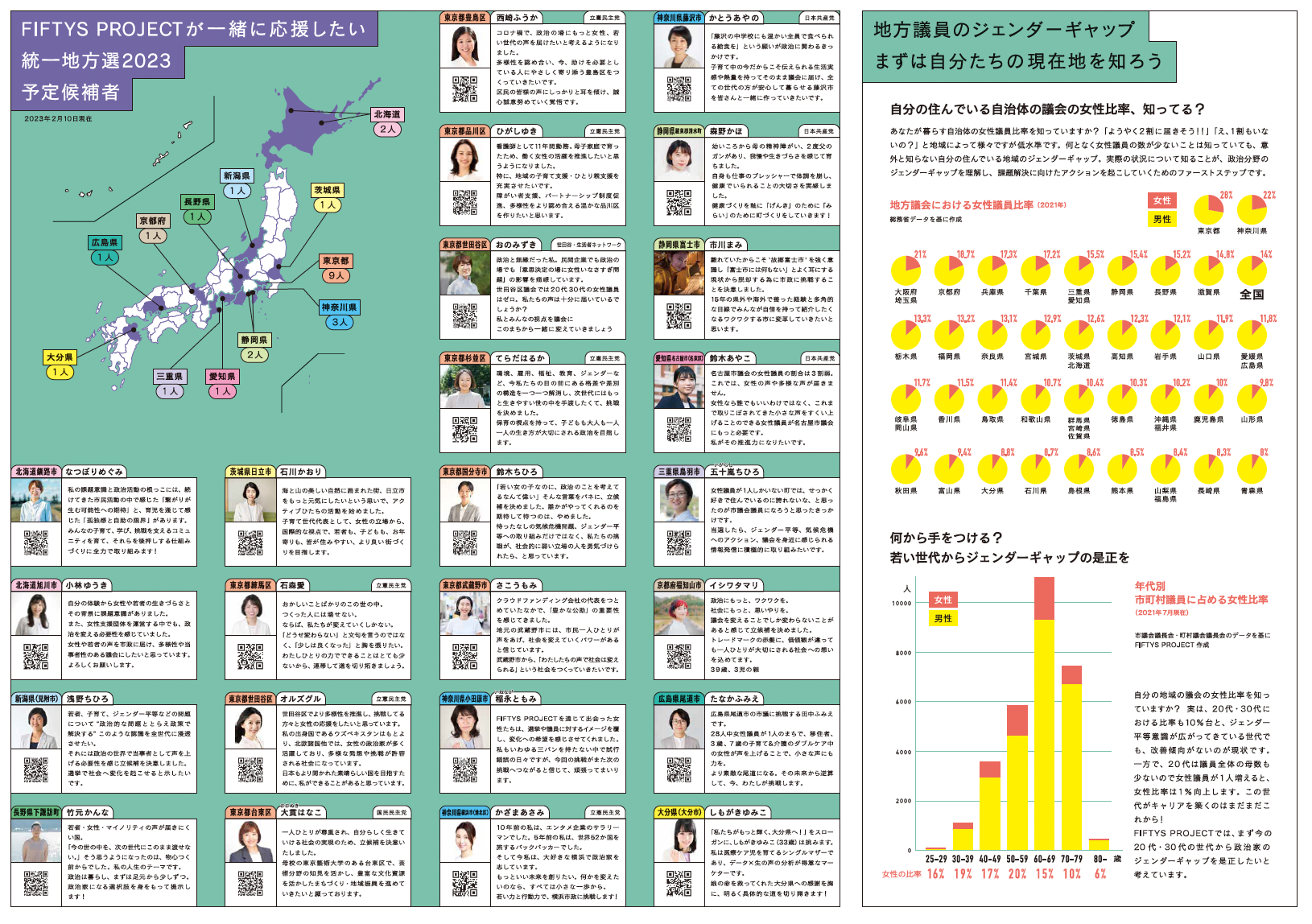 このタブロイド紙は、3月6日に行われる「3/6国際女性デーイベント:春は統一地方選挙!女性の政治家を増やすために私にできることを学ぼう!」で、FIFTYS PROJETCに共感するFIFTYS PROJECT COMMUNITY のメンバーに先行配布される予定です。FIFTYS PROJECT COMMUNITYのLINEオープンチャットには、すでに政治分野のジェンダー平等に関心を持つ10代~30代が240名以上参加しており、イベントや選挙ボランティアなどの情報交換を活発に行っています。課題意識を有するコミュニティメンバーにとってもこのタブロイドを活用して新たな活動、アクションにつなげていってもらうことを目指しています。