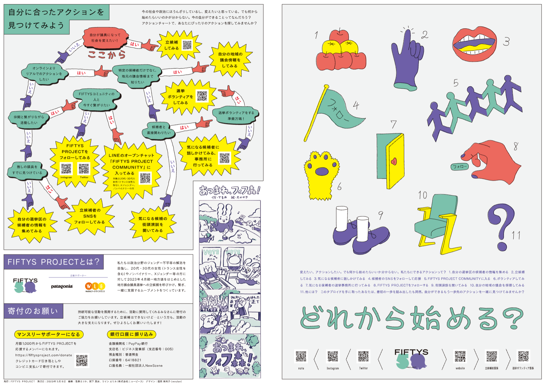 その内容として、「どれから始める?」という問いかけを表紙にしたタブロイド紙を作成。例えばFIFTYS PROJECTや気になる候補者のアカウントをフォローする、といった身近なアクションも、立派なアクションの一つであるとして示すことで、政治に参加するハードルを下げ、誰でもすぐにアクションができることを伝えています。