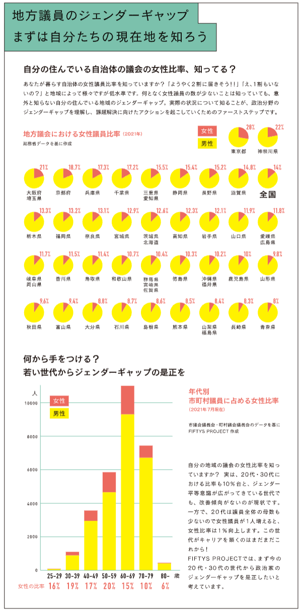 しかしながら、ジェンダーに対して比較的柔軟な思考を持っている世代であるからこそ、ここの世代からジェンダーギャップの是正を進めることも可能であり、この世代の政治アクションを促していくことにFIFTYS PROJECTはフォーカスしています。