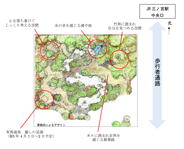 ・JR三ノ宮駅中央改札口より南を望む ・竹林に囲まれた自分を見つめる空間