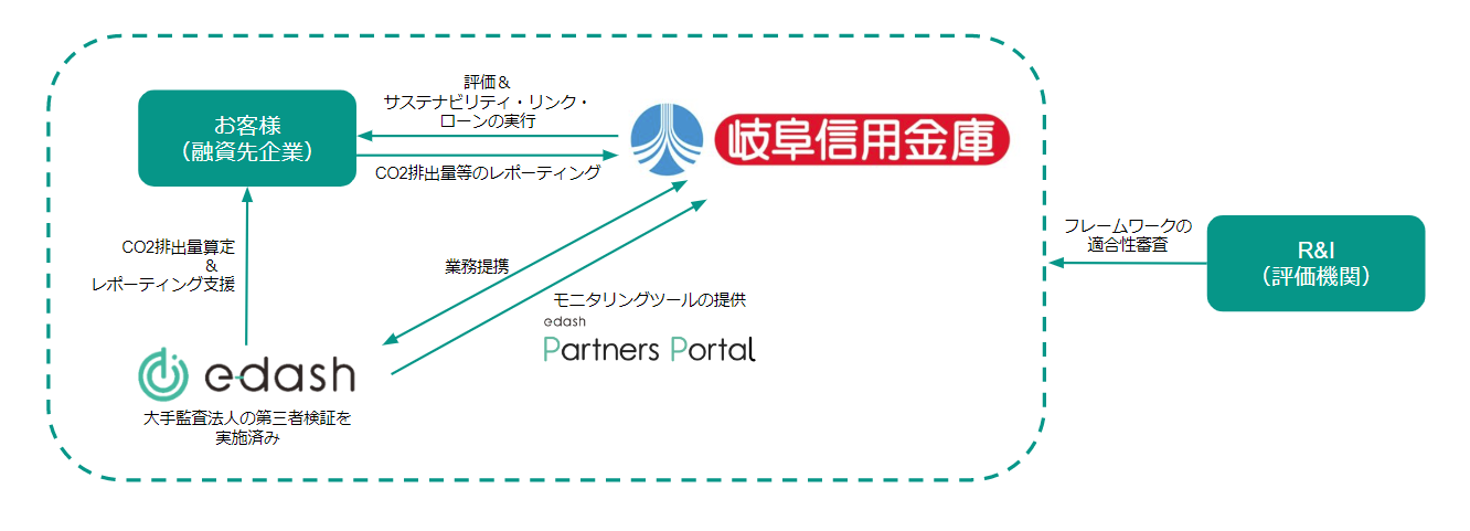 なお、本フレームワークは、評価機関である株式会社格付投資情報センター(以下、「R&I」)の適合性審査を受けています。このフレームワークにより、融資先のお客様は「e-dash」を用いて算出したCO2排出量等を岐阜信用金庫へ報告することで、SLLで通常必要とされる格付機関等からの第三者評価の実施費用を負担する必要なく、SLLを組成できるようになります。中小企業へのSLL組成のハードルとなっていたモニタリング体制の構築と第三者評価にかかるコストの問題を解消することで、融資機会の拡充が期待されます。