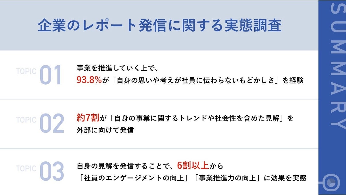 今回は、100名以上の企業の経営者96名を対象に、企業のレポート発信に関する実態調査を実施しました。