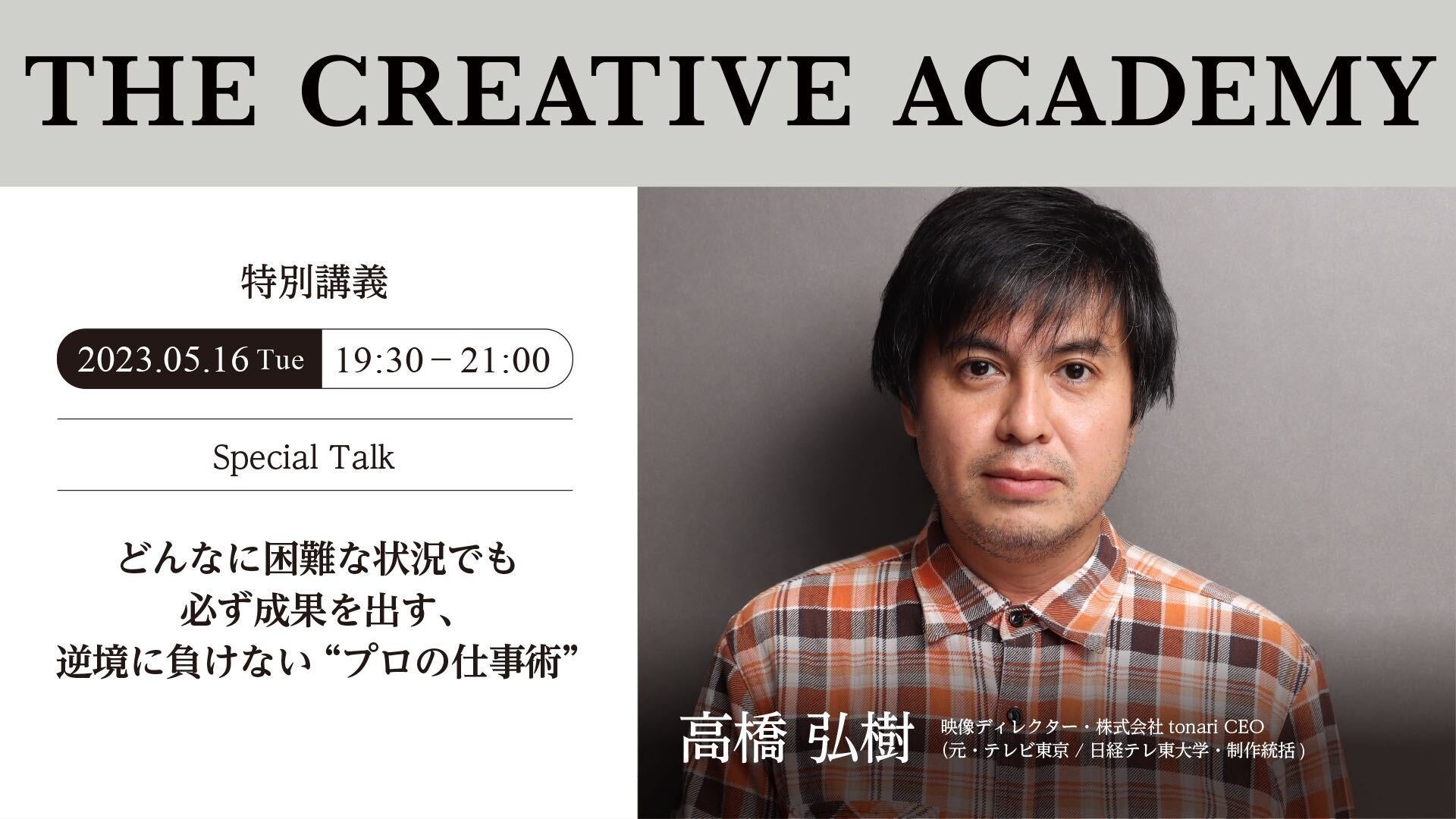 今回、4月より開講する「THE CREATIVE ACADEMY 2023 1st」の本講義に、高橋弘樹氏(元・テレビ東京 / 日経テレ東大学・制作統括)が追加登壇することが決定いたしました。