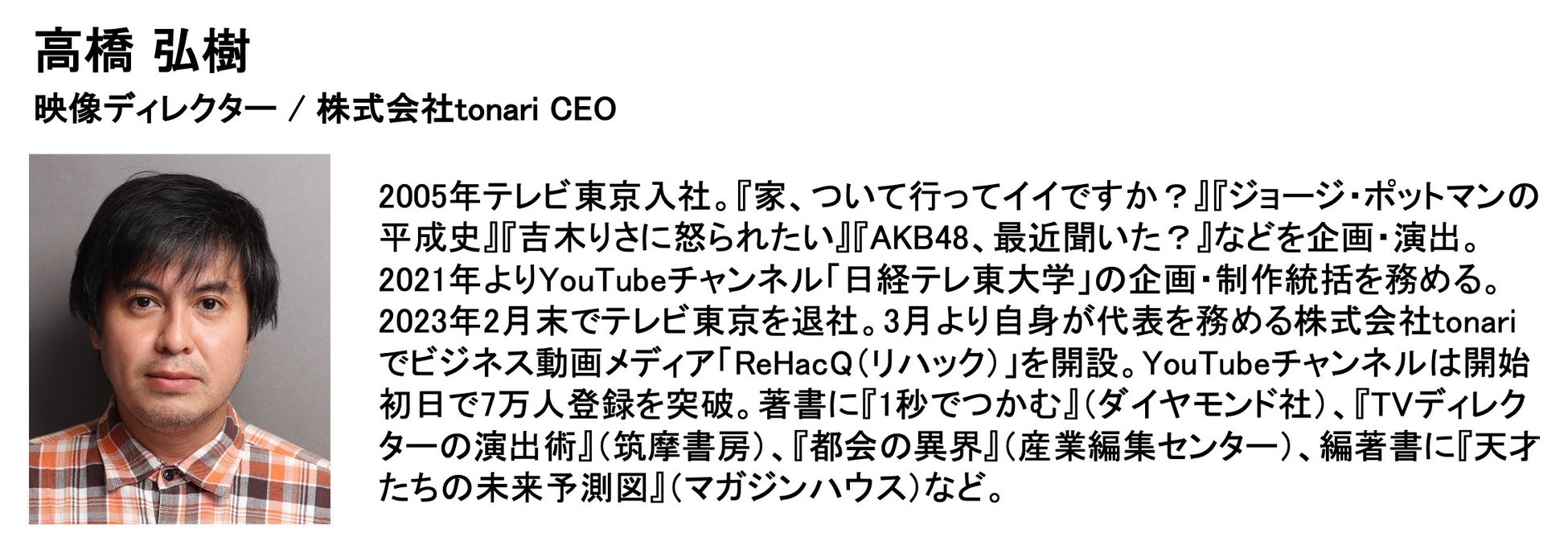 開始からわずか1年10ヶ月で“YouTube登録者数100万人”を達成したYouTubeの超人気チャンネル「日経テレ東大学」の仕掛け人である元・テレビ東京の高橋弘樹プロデューサー。偉業達成から僅か数日で、「テレビ東京退社」、「人気チャンネルの消滅」を経て、高橋氏は、この3月より自身のYouTubeチャンネル『ReHacQ(リハック)』を立ち上げました。