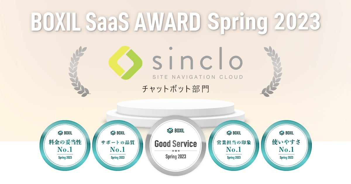 今回の「BOXIL SaaS AWARD Spring 2023」は、2022年1月1日から2022年12月31日までの1年間で新たに投稿された口コミ約14,000件を審査対象としており、「sinclo」は「チャットボット部門」で「Good Service」,「料金の妥当性No.1」,「サポートの品質No.1」,「営業担当の印象No.1」,「使いやすさNo.1」に選ばれました。