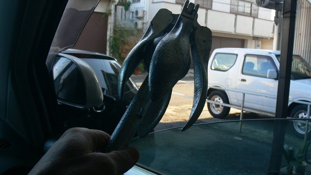 内陸部で潮が止まったところで、海まで流されない様錨を投入。潮が引いたら第2波に備えて錨を回収しておきます。パワーウインドのモーターを取り外しているので、窓は手で開閉できます。後部のハッチもロープを引っ張ると開錠して開けることが出来ます。