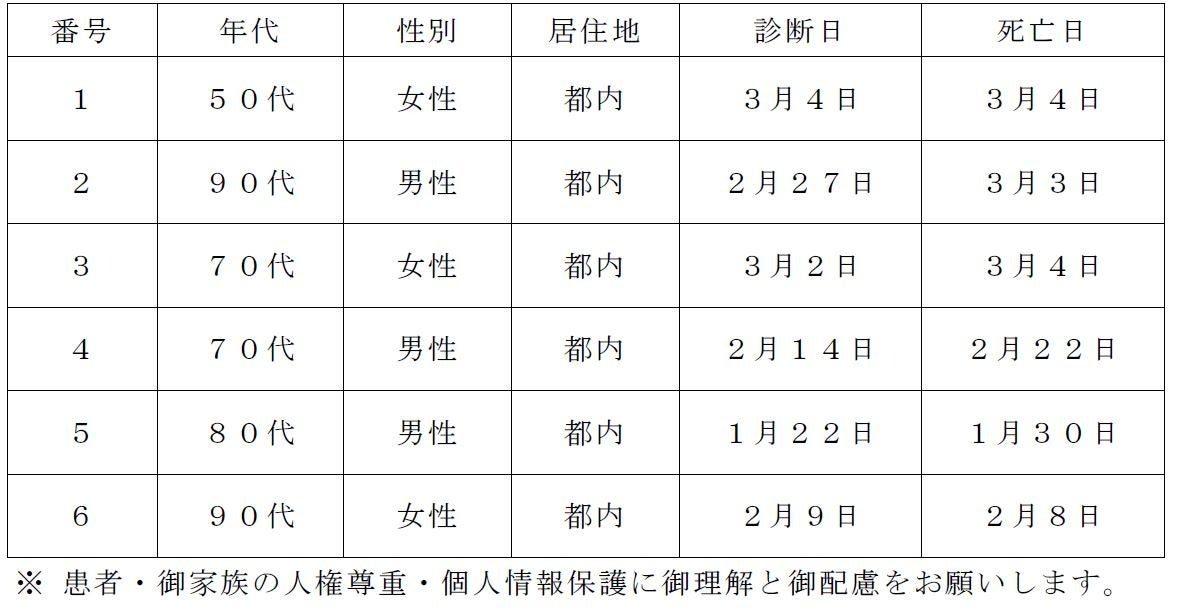新型コロナウイルスに関連した患者の死亡について business Twitter Facebook はてブ Pocket LINE コピー 2023.03.07 この記事は約1分で読めます。 都内で新型コロナウイルスに感染した方が死亡されましたのでお知らせします。 お亡くなりになった方のご冥福をお祈り申し上げます。 1 新型コロナウイルスに関連した死亡者(本日公表分) 2 新型コロナウイルスに関連した死亡者の累計 7,993人