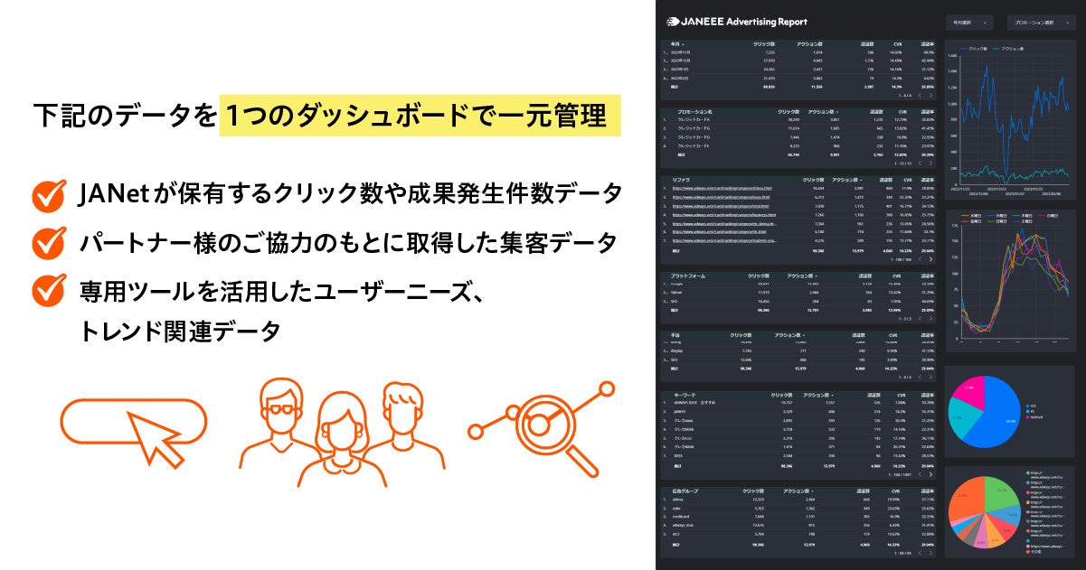 「JANEEE Advertising Report」は、当社のアフィリエイトサービス「JANet」をご利用中のパートナー様に活用いただけるデータ分析用ダッシュボードです。当社が保有するクリック数や成果発生件数等のデータに加え、パートナー様のご協力の元に取得した集客データや、専用ツールを活用したユーザーニーズ・トレンド関連データをダッシュボード上で可視化することで、パートナー様の分析環境を向上し、アフィリエイト広告最適化と収益の最大化を支援いたします。