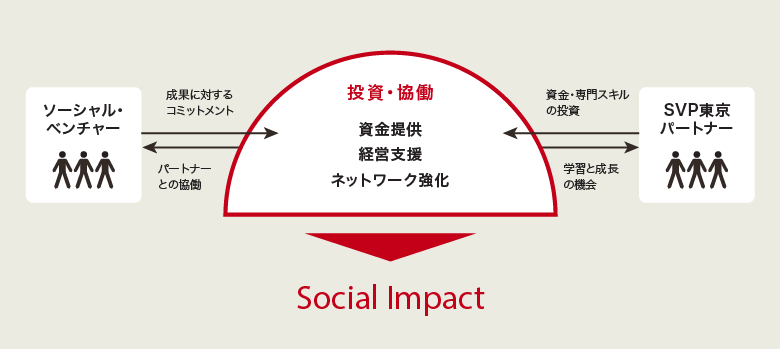 SVP東京は、社会的な課題の解決に取り組む革新的な事業に対して、資金の提供と、パートナーによる経営支援を行っています。SVP東京は、投資協働を行うソーシャルベンチャーのミッション達成に貢献すると同時に、パートナー自身が、投資・協働団体への支援に参画し、地域や社会への関与を通じて、イノベーションに貢献することをその使命としています。SVP東京は、ソーシャルベンチャーと有志のパートナーたちがチームとなって、仲間と共に学びながら活動し、社会変革を目指すコミュニティです。パートナー同士が互いに創造性を発揮しあい、本気で向き合う場づくりと自律的運営を心掛けています。