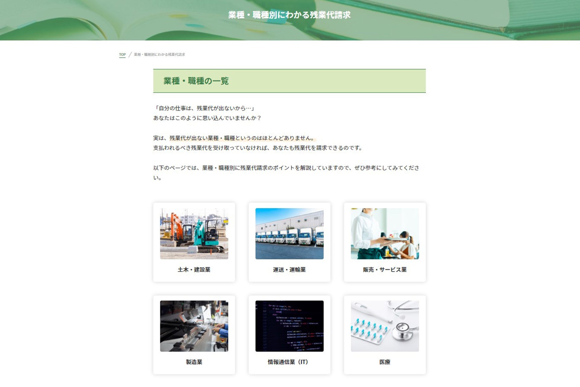 残業代の未払いに悩むさまざまな職業の方に向け、業種・職種別のコンテンツのデザインや構成を一新しました。