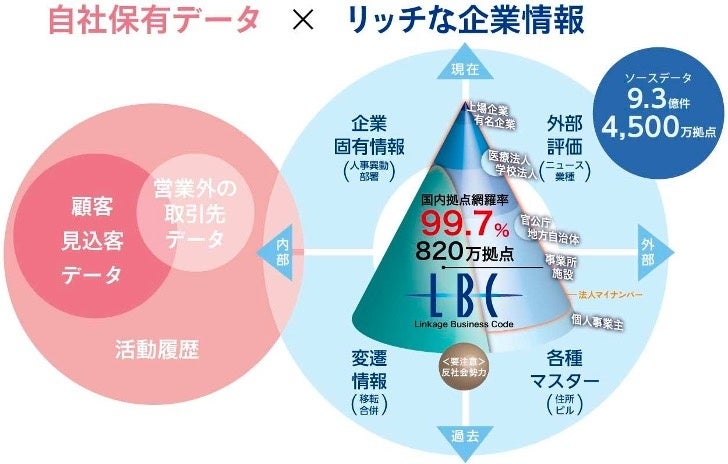 「LBC」には、国内約820万拠点の事業所の情報が網羅されており、法人番号や業種、売上規模などの企業属性だけでなく、企業コード体系により、親会社・子会社などの企業の資本関係や本社・事業所関係などの企業系列まで把握することが可能です。