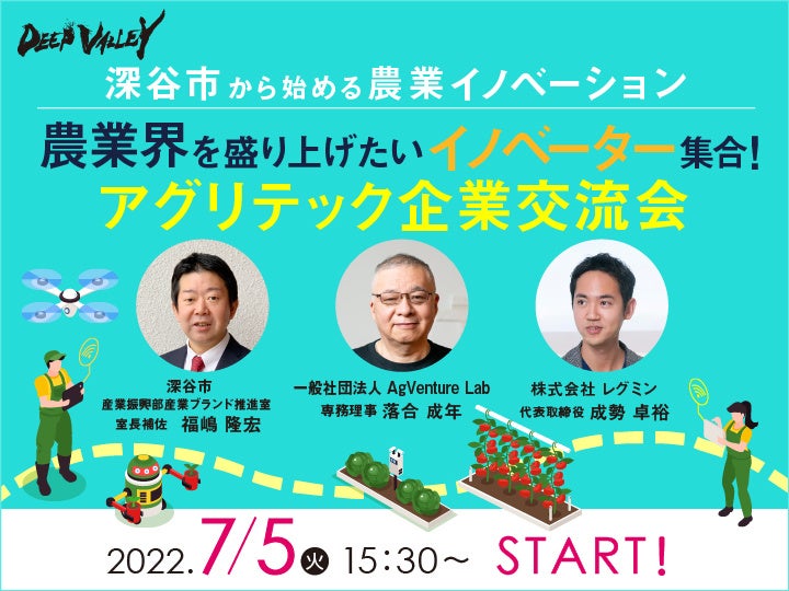 当日は当ラボ専務理事の落合、深谷市で農薬散布ロボットの実証事業を進めているアグリテックスタートアップ企業「株式会社レグミン」代表取締役である成勢氏、「深谷市産業ブランド推進室」室長補佐の福嶋氏によるトークセッションを実施します。