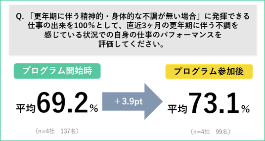 また、更年期による不調を感じている状況での仕事におけるパフォーマンスについては、プログラム開始時は平均69.2%でしたが、プログラム参加後は平均73.5%となり、3.9ポイントの向上が確認できました。