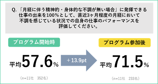 月経による不調を感じている際の仕事のパフォーマンスについては、プログラム開始時は平均57.6%でしたが、プログラム参加後は平均71.5%となり、13.9ポイントの向上が確認できました。