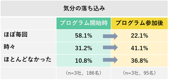 「気分の落ち込み」といった精神的な症状についても、プログラム開始時は「ほぼ毎回」感じると回答した割合は58.1%だったのに対し、プログラム参加後は22.1%にまで 減少し、「ほとんどなかった」と回答した割合は10.8%から36.8%と3倍以上となりました。