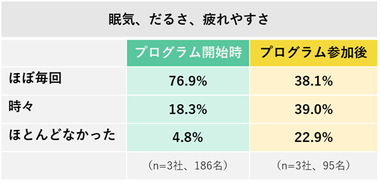 プログラム開始時と参加後で、変化が大きかった症状の上位3つを紹介します。まずひとつめは、「眠気、だるさ、疲れやすさ」で、プログラム開始時は「ほぼ毎回」感じると回答した人が76.9%いたのに対し、3カ月後には38.1%にまで減少し、「ほとんどなかった」の回答は開始時には4.8%でしたが、プログラム参加後は22.9%にまで増加しています。
