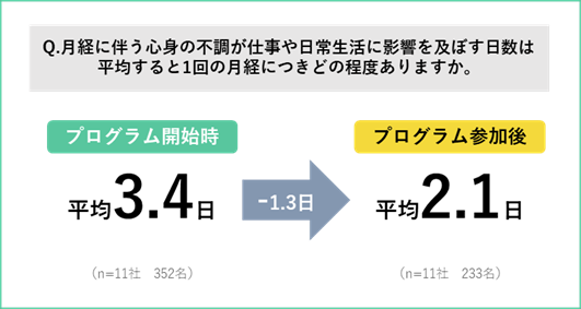 月経に伴う心身の不調による日常生活への影響日数については、プログラム開始時は、1回の月経につき平均3.4日だったのに対し、プログラム参加後は2.1日となり、1.3日減少していることが分かります。