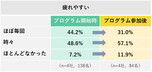 次に「疲れやすい」という症状について、「ほぼ毎回」感じている人がプログラム開始時に44.2%いたのに対し、プログラム参加後は31.0%と10ポイント以上減少してい ることが分かります。「時々」の回答は48.6%から57.1%と約10ポイント増加しており、症状を感じる頻度が少なくなってきているようです。