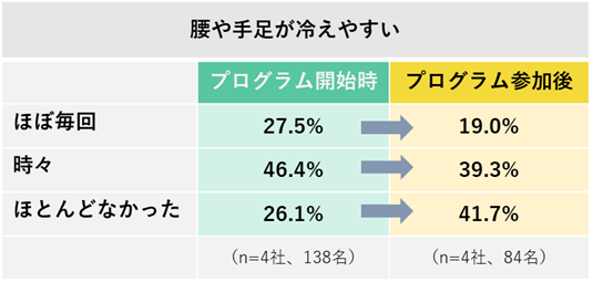 また、「腰や手足が冷えやすい」という症状については、プログラム開始時、27.5%の人が「ほぼ毎回」感じると回答していましたが、プログラム参加後は19.0%に減少し、「ほとんどなかった」の回答が26.1%から41.7%と、15.6ポイント増加していることが分かります。