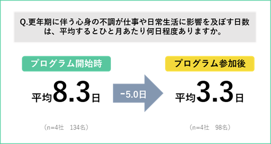 更年期の症状が日常生活に影響を与える日数は、プログラム開始時は1カ月あたり平均8.3日でしたが、プログラム参加後は平均3.3日となり、5.0日の減少が確認できました。