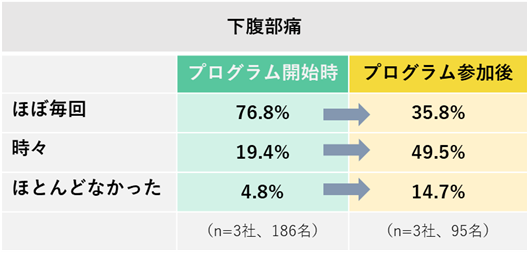 続いて「下腹部痛」に関しても、プログラム開始時は「ほぼ毎回」感じると回答した人が76.8%いたのに対し、プログラム参加後は35.8%と半数以下にまで減少し、「ほとんどなかった」の回答は4.8%から14.7%まで増加するなど、症状の改善が実感されていることが分かります。