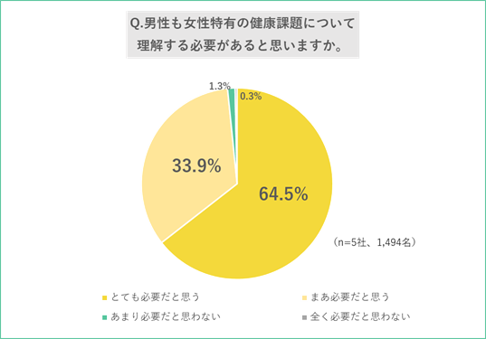回答結果は、「とても必要だと思う」64.5%、「まあ必要だと思う」33.9%となり、合計すると98.4%の男性が女性の健康課題を理解する必要性を感じていることが分かりました。
