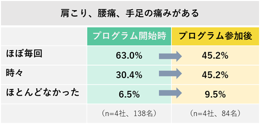 プログラム参加後に変化が大きかった 主な症状の上位3つには、まず「肩こりや腰痛、手足の痛みがある」が挙げられました。プログラム開始時は「ほぼ毎回」感じると回答した割合は63.0%にのぼり、過半数の人が抱える症状であることがうかがえましたが、プログラム参加後は45.2%にまで減少し、「時々」と回答した割合は30.4%から45.2%に増加しています。