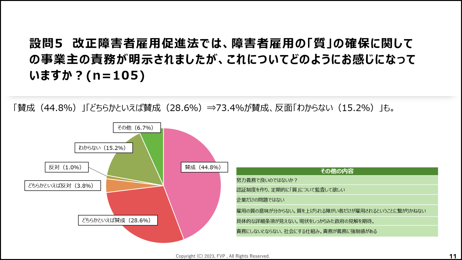 「数値だけの達成では意味がない」「本業に寄与してこその障害者雇用である」「当たり前な内容で当然賛成だが、内容が表面的で甘いため実質的には多くの会社では変化はほぼ無いような気がする」など、回答企業が、日頃から質の確保に意識を向けて取り組んでいる様子がうかがえる一方で、「法改正で意図するポイントが理解できない」「質の確保に対して具体的な指針が示されていない」「中小企業の腰が重くなるのでは」「企業負担が大きすぎる」等の率直な意見も見られた。