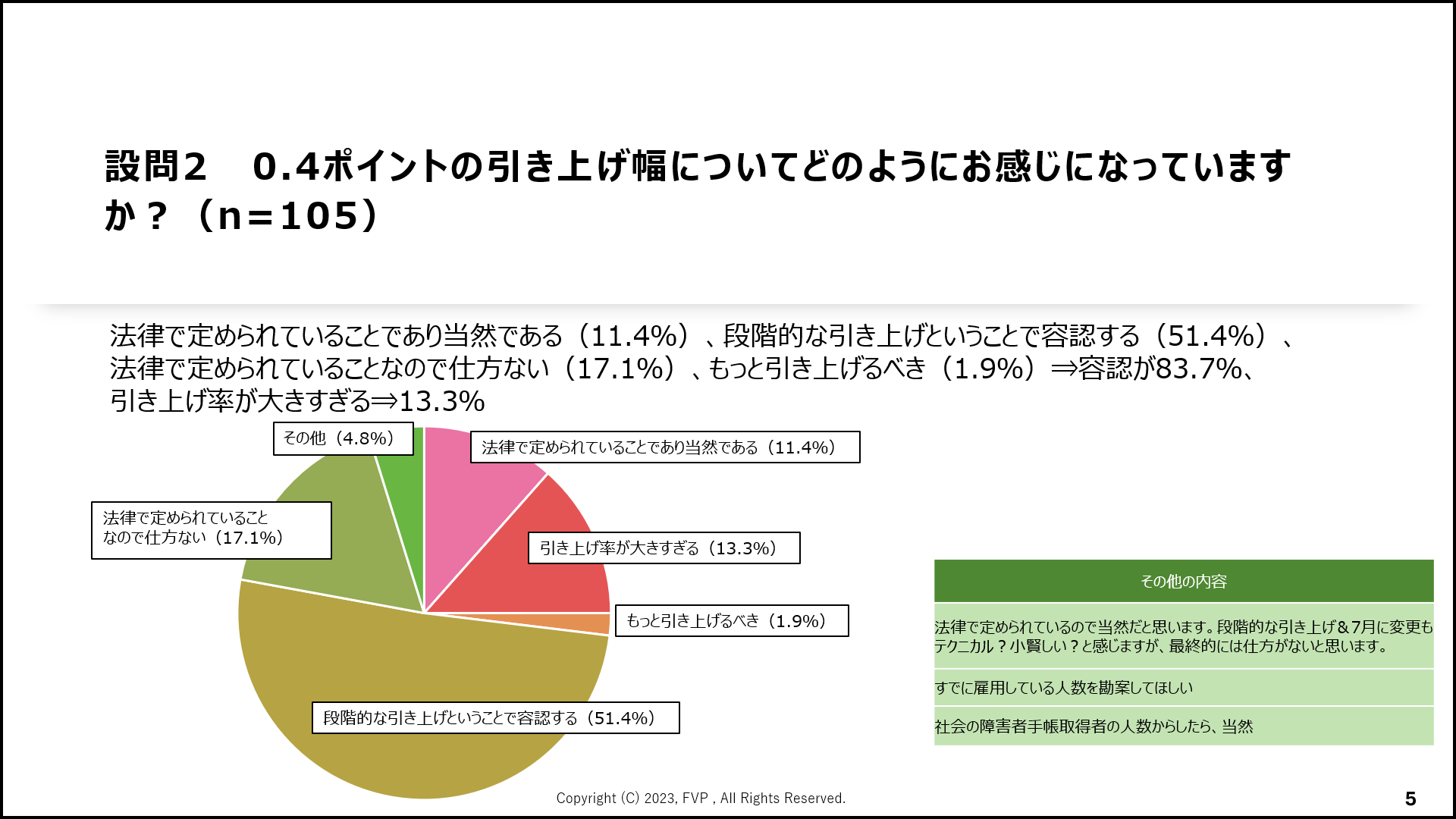 ・雇用率の2.7%への引き上げについて、「法律で定められていることであり当然である(13.5%)」「段階的な引き上げということで容認する(51.0%)」との回答が得られ、6割以上が概ね賛成の意向を示した。「法律で定められていることなので仕方がない」という消極的な賛成が17.3%、逆に少数だが「もっと引き上げるべき」という意見も1.9%見られ、これらを合わせた83.7%が雇用率引き上げを容認している。