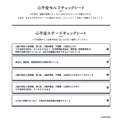 いただけるよう、患者さんご自身で症状や病態をチェックできる 「心不全セルフチェックシート」https://heart-failure.jp/check/ が追加されました。このチェックシートを使用することで、心不全のどのステージに該当するのか、ご自身で確認できるようになりました。