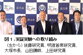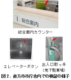 新型コロナウイルス感染症が蔓延している中、感染症への市民の皆様の関心が高まっています。さらに、アフターコロナの時代においても感染症への対策は継続して必要です。そのため、直方市では大塚市長を中心に感染症対策に常に積極的に取り組んできました。その一環として、市民が利用する市役所などの公共施設での接触感染のリスク低減ができるよう、抗ウイルスコーティングの導入を検討しています。皆様に安心して利用いただける抗ウイルスコーティングには、ウイルスの不活性化効果だけでなく、その効果の持続性も重要です。直方市では、国立研究開発法人産業技術総合研究所(つくば市)と就実大学(岡山市)が実用化に向けて開発した先進の抗ウイルスコーティングの実用性の検証に協力し(図1,2)、感染症対策に取り組むことで、近い将来、市民が安心して利用する環境を整えることができると考えています。