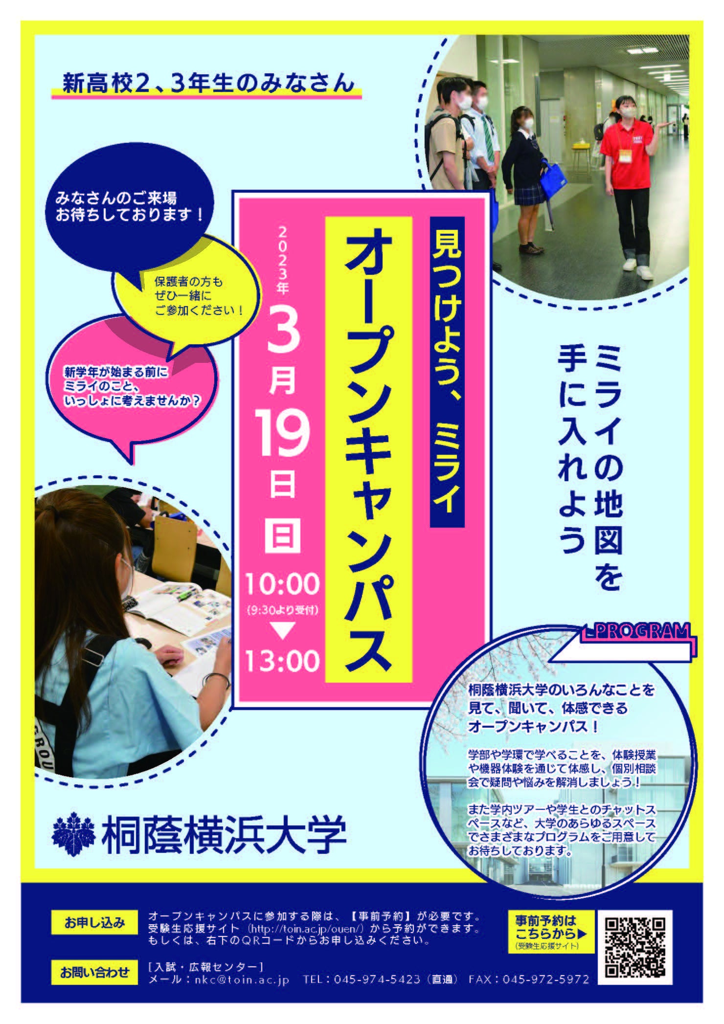 それぞれの企画を通じて、桐蔭横浜大学での学びのこと、大学生活のこと、卒業後の進路のことなどについて理解を深めていただければと思います。