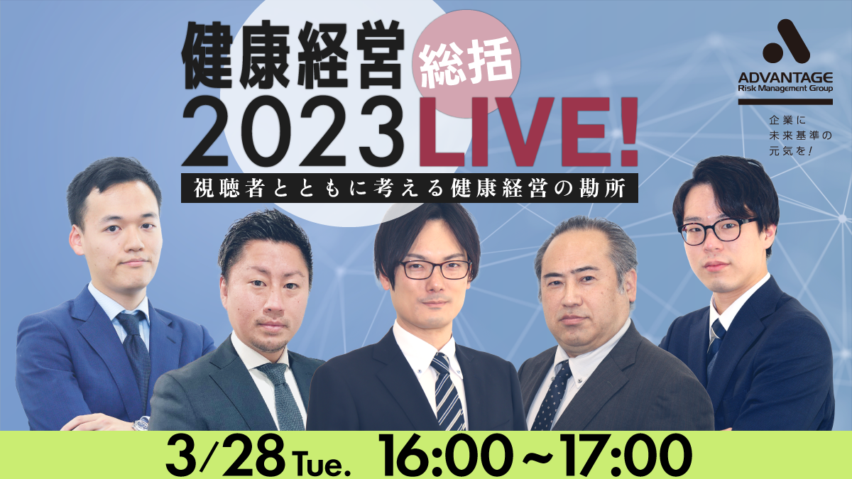3月28日(火)、「健康経営2023総括LIVE!~視聴者とともに考える健康経営の勘所~」と題し、シニアコンサルタントの永井と、当社の健康経営実務担当者の木浦ほか3名による座談会形式のセミナーを開催します。実際の評価結果をもとにした健康経営の推進ポイントや、取り組むなかでの工夫点や苦労点などもお伝えしながら、今後の健康経営のあり方について、人事・コンサルタントそれぞれの視点から議論を交わします。