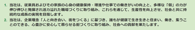 今後も、従業員一人ひとりがモチベーションを持って健康でいきいきと働くためには、従業員の健康・メンタル面の管理・サポートが重要な経営課題であるとの考えの下、健康経営を推進し、当社の事業を通じて社会に貢献してまいります。