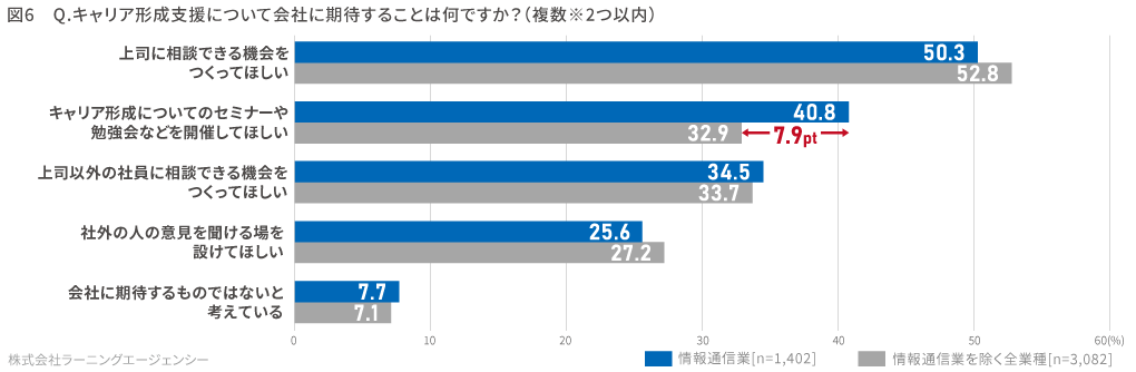 キャリア形成支援について会社に期待することは何か尋ねた質問においては、「上司に相談できる機会をつくってほしい(50.3%)」が他業種同様最多となりましたが、2位3位は入れ替わり、「キャリア形成についてのセミナーや勉強会などを開催してほしい(40.8%)」が7.9ポイントの差をつけ2位、「上司以外の社員に相談できる機会をつくってほしい(34.5%)」が3位に入りました。(図6)