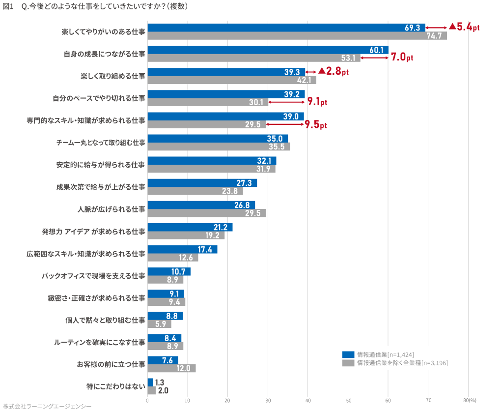 「今後どのような仕事をしていきたいですか」という設問に複数回答で答えてもらったところ、最多となったのは「楽しくてやりがいのある仕事(69.3%)」、2位は「自身の成長につながる仕事(60.1%)」、3位は「楽しく取り組める仕事(39.3%)」でした。いずれも、情報通信業を除く全業種(以下、他業種と記載)と同じ順位になりましたが、「楽しくてやりがいのある仕事」「楽しく取り組める仕事」は、他業種よりもそれぞれ5.4ポイント、2.8ポイント低く、逆に「自身の成長につながる仕事」は7.0ポイント高い結果となりました。「自分のペースでやり切れる仕事(39.2%)」「専門的なスキル・知識が求められる仕事(39.0%)」の割合も他業種と比較すると高く、10ポイント近く差がつく結果となりました。(図1)