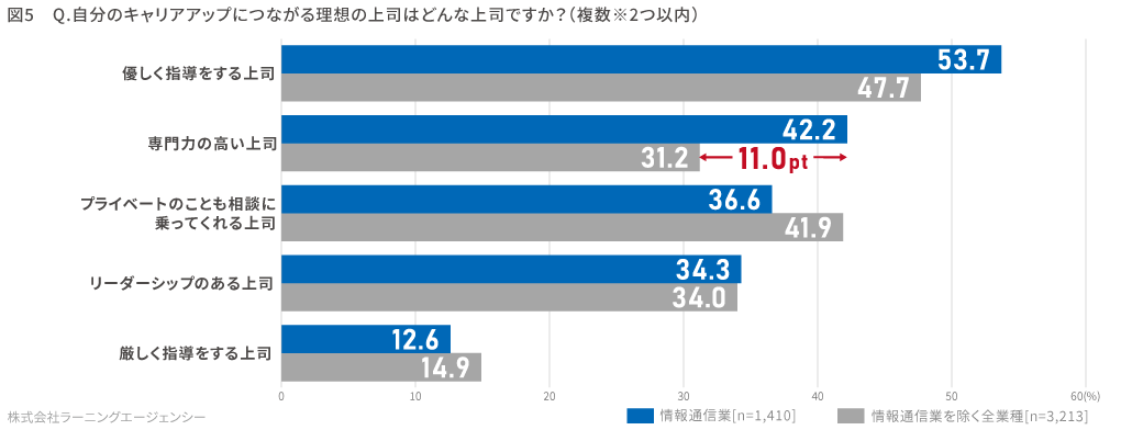 「自分のキャリアアップにつながる理想の上司はどんな上司ですか」という設問に2つ以内の複数回答で答えてもらったところ、1位は他業種と同じく「優しく指導をする上司(53.7%)」だったものの、2位は「専門力の高い上司(42.2%)」で他業種より11.0ポイントも高い結果となりました。(図5)