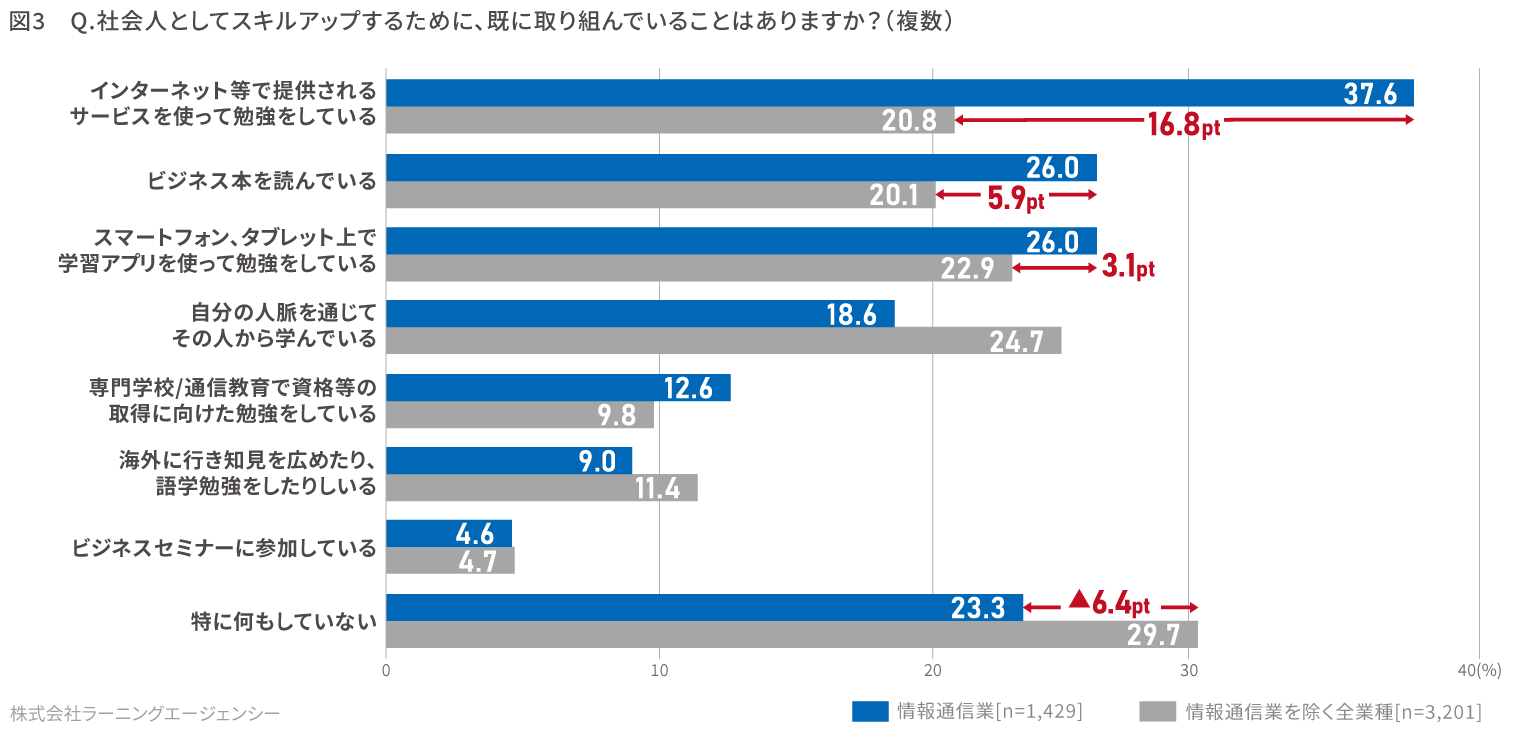 次に、社会人としてスキルアップするために既に取り組んでいることはあるかを複数回答で尋ねたところ、情報通信業の新入社員は「インターネット等で提供されるサービスを使って勉強をしている(37.6%)」を選んだ割合が圧倒的に多く、他業種と16.8ポイントもの差になりました。続いて「ビジネス本を読んでいる(26.0%)」「スマートフォン・タブレット上で学習アプリを使って勉強をしている(26.0%)」が同率、それぞれ他業種より5.9ポイント、3.1ポイント高い結果となりました。一方、他業種で1位となった「特に何もしていない(29.7%)」は情報通信業では6.4ポイント低く、4位でした。(図3)
