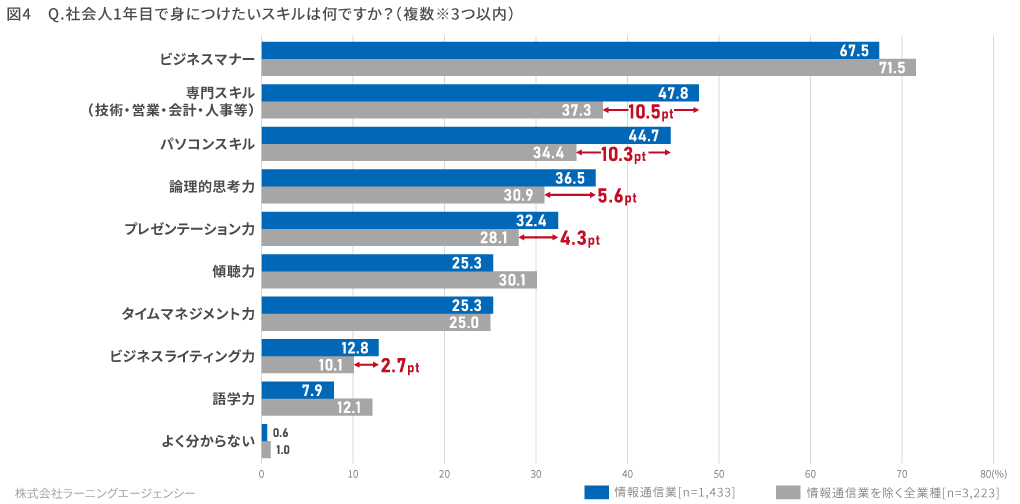 続いて、社会人1年目で身につけたいスキルは何かを複数回答で尋ねたところ、他業種の新入社員と同じく1位「ビジネスマナー(67.5%)」、2位「専門スキル(技術・営業・会計・人事等)(47.8%)」、3位「パソコンスキル(44.7%)」でした。順位は同じものの、専門スキルとパソコンスキルについては他業種よりも10ポイント以上高くなりました。その他「論理的思考力(36.5%)」「プレゼンテーション力(32.4%)」「ビジネスライティング力(12.8%)」なども5.6ポイント、4.3ポイント、2.7ポイント他業種よりも高い結果となり、様々なスキルを求めていることがわかりました。(図4)