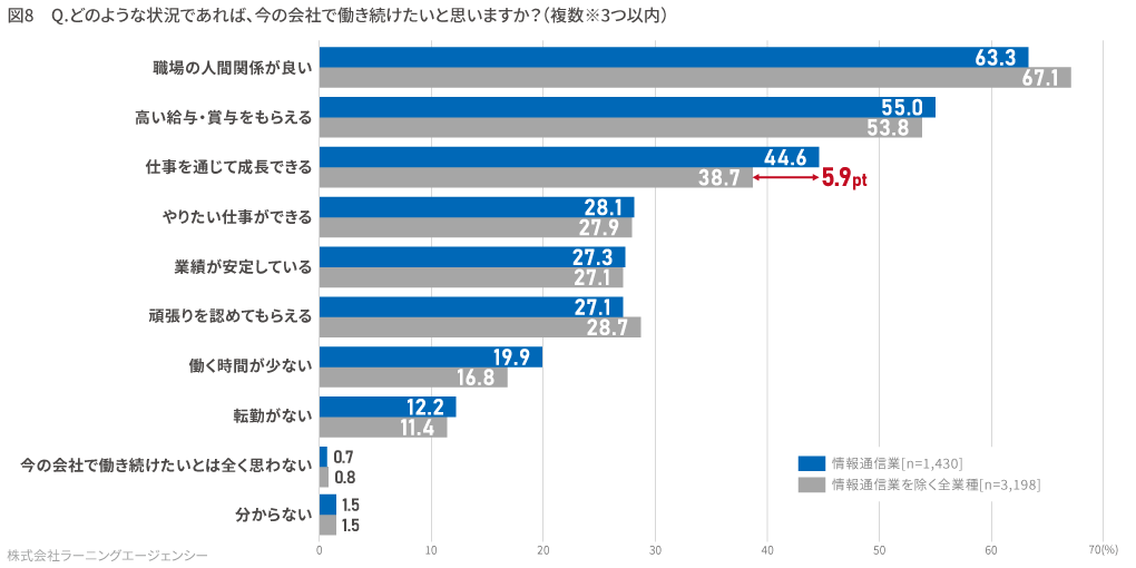く1位「職場の人間関係が良い(63.3%)」、2位「高い給与・賞与をもらえる(55.0%)」、3位「仕事を通じて成長できる(44.6%)」でした。「仕事を通じて成長できる」は3位ではあるものの、他業種よりも5.9ポイント高い結果となりました。(図8)