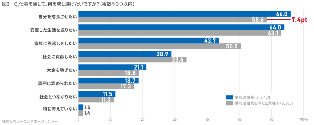 「仕事を通して成し遂げたいこと」について尋ねる質問では、情報通信業の新入社員は「自分を成長させたい」を選んだ割合が最多の66.0%で、他業種よりも7.4ポイント高い結果に。他業種では「安定した生活を送りたい(63.1%)」が1位、「自分を成長させたい(58.6%)」は2位で、順位が入れ替わる結果となりました。(図2)