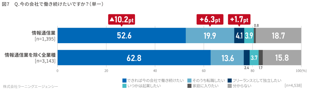 「今の会社で働き続けたいですか」という設問には、業種に関わらず過半数が「できれば今の会社で働き続けたい」と答えました。しかし、情報通信業では他業種よりも10.2ポイント低い52.6%にとどまっています。一方、「そのうち転職したい」は19.9%、「フリーランスとして独立したい」は4.1%で、それぞれ他業種より6.3ポイント、1.7ポイント高い結果となりました。(図7)