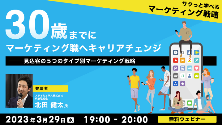 初回となる今回のテーマは、「見込客の5つのタイプ別マーケティング戦略」。売りたい商品やサービスに関心を持っていて、近い将来購入の可能性がある対象者=見込客について、どんな方が見込客になり得るのか、どんなアプローチが効果的なのかなど、「見込客」に焦点を当てたマーケティング戦略について解説いたします。マーケティング職にチャレンジしたい方は、キャリアチェンジへの足掛かりとして、ぜひご参加ください。